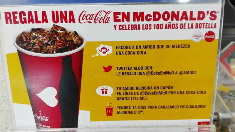 • Necesitas una cuenta de Twitter, despues debes Twittear algo como: “Le regalo una @CokeEnMcD a@Amigo(algún contacto de ustedes).