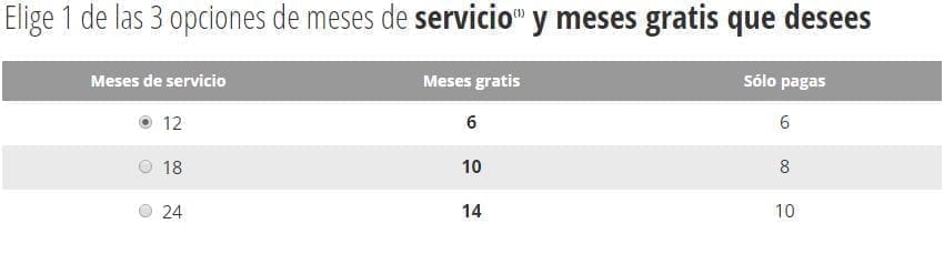 A continuación te presentamos los meses de servicio gratis correspondientes a los meses de contratación.