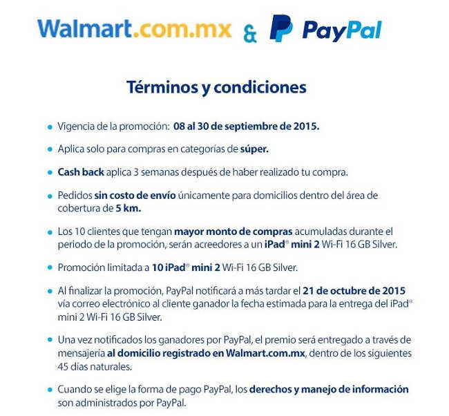 Si compras mínimo $1000 en Walmart Súper en línea y pagas con Paypal, te regresan $100 en cashback. Ademas te regalan envió gratis en todos tus pedidos en un radio de 5 km. El Cashback aplica 3 semanas después de haber realizado la compra. Aparte en la publicidad mencionan que si son 1 de los 10 clientes con más compras acumuladas en ese periodo de tiempo se pueden ganar un iPad mini 2.