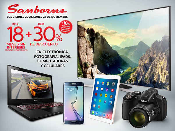 - Hasta 18 meses sin intereses con tarjetas bancarias participantes y hasta 30% de descuento en electrónica, fotografía, iPads, computadoras y celulares.