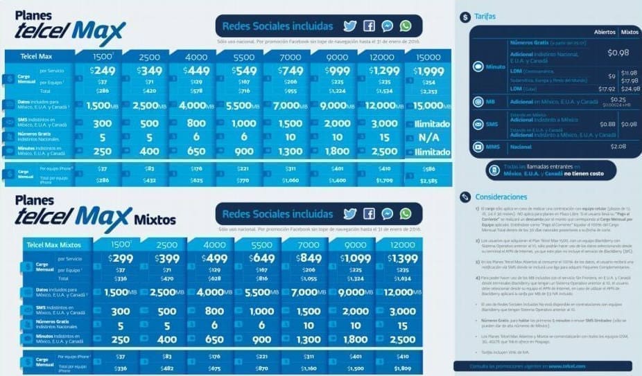 Telcel lanza nuevos planes de pospago llamados Planes Telcel Max y MAX mixto, donde todos los servicios tienen un incremento considerable comparado con los planes Telcel Pro. En la imagen puedes ver las tablas con todos los detalles.