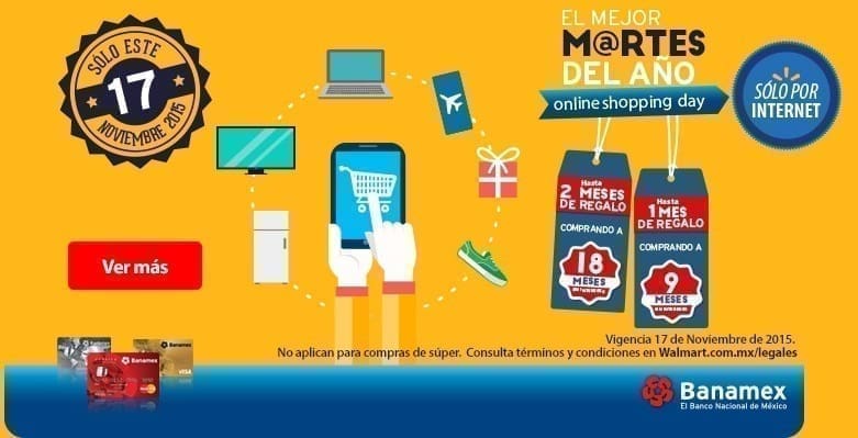 Como cada año después del buen fin Walmart en linea continúan con ofertas este Cybermartes 17 de noviembre, esta vez  tiene hasta 18 meses sin intereses y 2 meses de bonificación o 9 meses sin intereses y 1 de bonificación, al pagar con tarjetas de crédito Banamex. Ademas provecha envío gratis en todo el sitio. Más detalles en la página walmart.com.mx