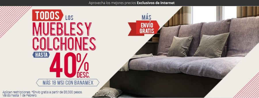 La tienda en linea Famsa tiene una promoción exclusiva por Internet tiene todos los muebles y colchones con hasta 40% de descuento más 18 meses sin intereses con Banamex. Ademas tiene envío gratis en compras mayores a $5,000.