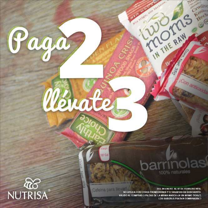 Las tiendas Nutrisa tienen la promoción de 3×2 en todas las barras nutritivas, si este año una de tus metas es cuidar tu salud acude a Nutrisa y aprovecha esta promo ahorrando en barras de cereal, granola y más. Los productos de diversas marcas no pueden combinarse pero si se pueden combinar productos de la misma marca pero distinto sabor.