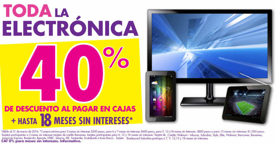 Las tiendas Suburbia tienen todo el departamento de electrónica con 40% de descuento al pagar en cajas mas hasta 18 meses sin intereses.