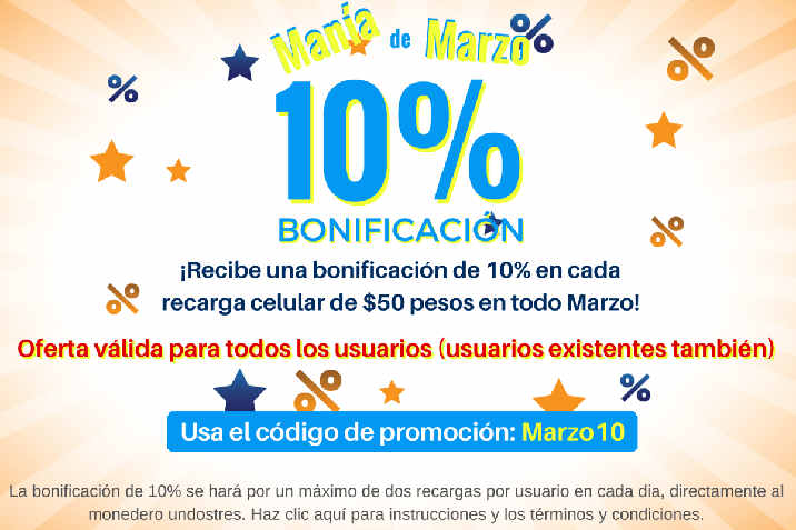 Undostres tiene la promoción de 10% de bonificación en cada recarga de $50 pesos en tu celular durante todo el mes de marzo. Sólo debes usar el cupón promocional Marzo10