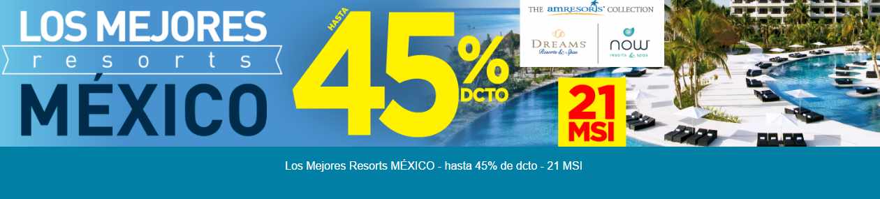 Despegar.com tiene una nueva promoción de hasta 45% de descuento en los mejores resorts de México (Hoteles de alta categoría), además puedes pagar hasta en 21 meses sin intereses.