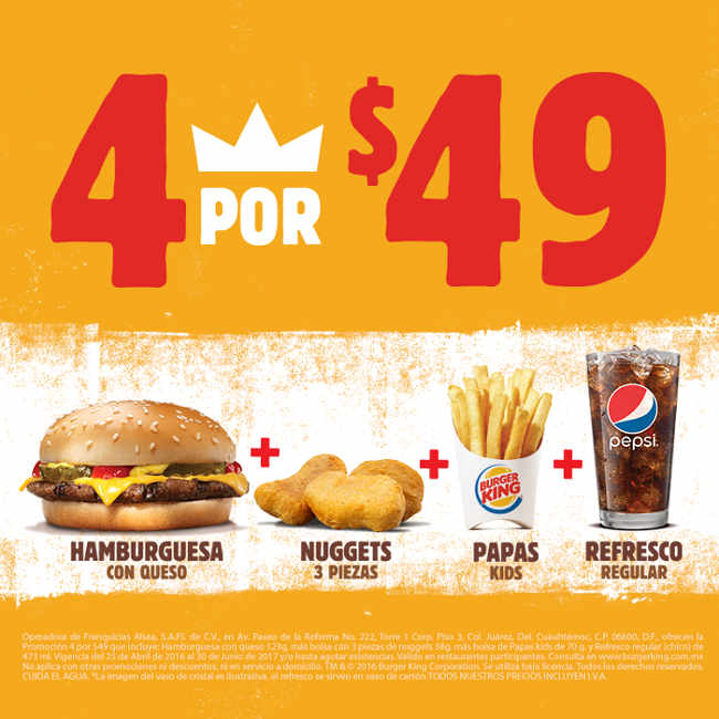 Burger King: combo hamburguesa + nuggets + papas + refresco por $49