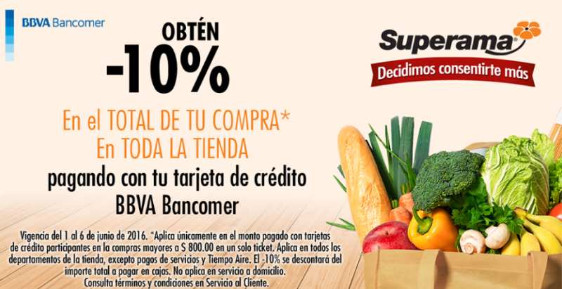 Superama te ofrece esta excelente promoción llena tu despensa con 10% de descuento en toda tu compra si pagas con tarjetas de crédito Bancomer.