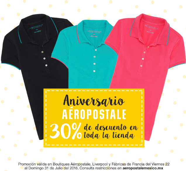 Aeropostale tiene una promoción de aniversario en la que podrás comprar en toda la tienda con 30% de descuento. Aplica en boutiques Aeropostale, en Liverpool y en Fábricas de Francia.