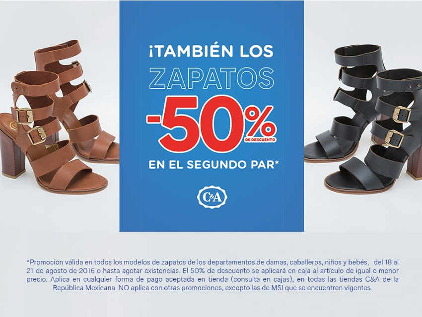 La tienda en línea de C&A tiene 50% de descuento en el segundo par de zapatos. Esta promoción aplica en todos los modelos de zapatos de los departamentos de damas, caballeros, niños y bebés