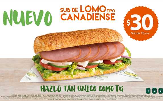 Los Restaurantes Subway tiene un nuevo “Sub” en su menú, se trata del Nuevo Sub 15 cm que tiene como ingrediente principal Lomo de Cerdo tipo Canadiense y puedes adquirirlo con un precio de lanzamiento de sólo $30 pesos.