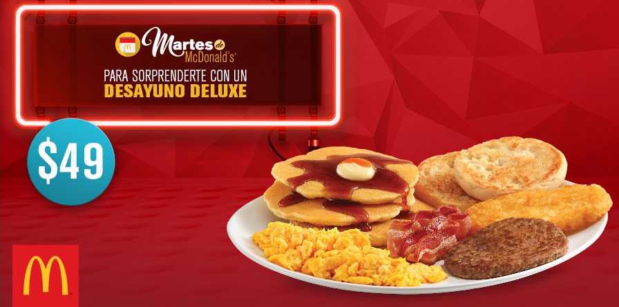Esta semana en los Martes de McDonald’s podrás disfrutar un Desayuno deluxe por $49 pesos que incluye hot cakes, huevo, tocino, carne, papas y pan, este martes 24 de enero, muestra este cupón en tu celular en los restaurantes McDonald´s participantes antes de las 12 pm. El código de cupón puede ser utilizado una sola vez.