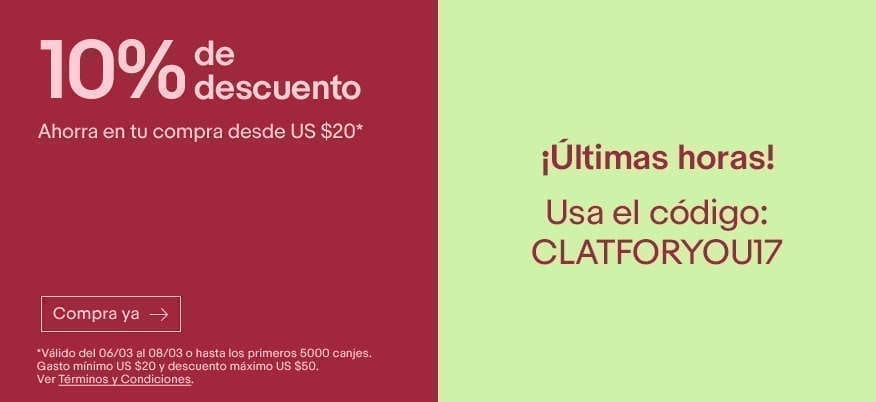 - Obtén 10% de descuento en todo el sitio de eBay.com con el cupón CLATFORYOU17, que deben usar antes de pagar con Paypal.