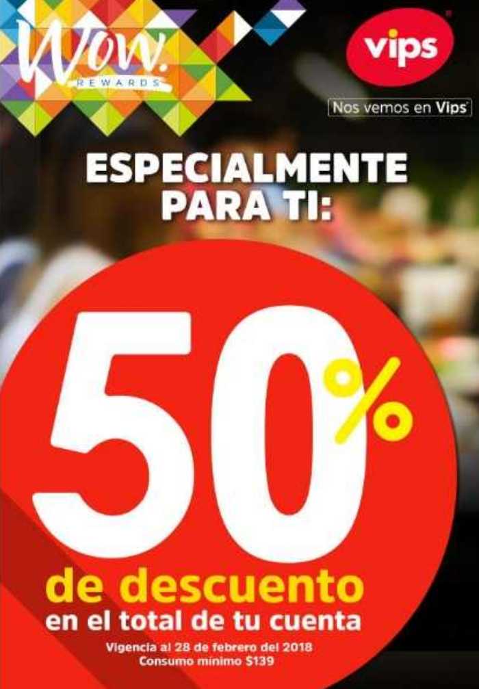 No te pierdas la nueva promoción de Vips si  eres miembros de Wow Rewards  puedes disfrutar de hasta 50% de descuento sobre el total de tu cuenta del 22 al 28 de febrero del 2018. No olvides presentar tu tarjeta Wow Rewards al momento de pedir la cuenta, Para hacer valido el descuento.