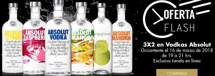 - 3×2 en Vodka Absolut varios sabores valido solo el viernes 16 de marzo de 19 a 21 horas, comprando exclusivamente en la tienda online.