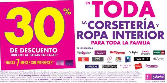 • 30% de descuento directo al pagar en cajas y hasta 7 meses sin intereses en toda la corteseria y ropa interior para toda la familia, las marcas participantes son: Vicky Form, Ilusión, Baby Creysi, Playtex, Maiden Form, Rinbros, Wilson, Everlast, Odisea, Fruit of the Loom, Marel, Vasarette, Berlei, Curvation, Carnival, Hanes, Pinky, Nine Months.