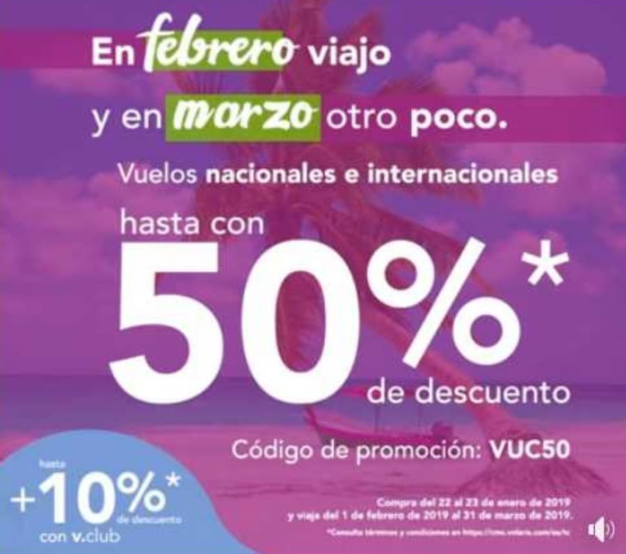 Reserva tu vuelo en Volaris aprecios que no podrás creer trae esta promoción especial de febrero y marzo del 2019, aprovecha hasta 50% de descuento en todas las rutas nacionales e internacionales y si eres miembro v.club te darán un 10% de descuento adicional.