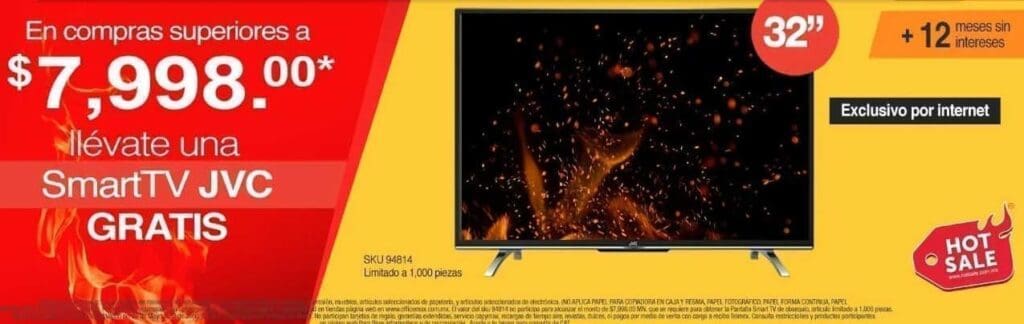 - En compras mayores a $7,998.00 te dan GRATIS una Smart TV JVC de 32’’