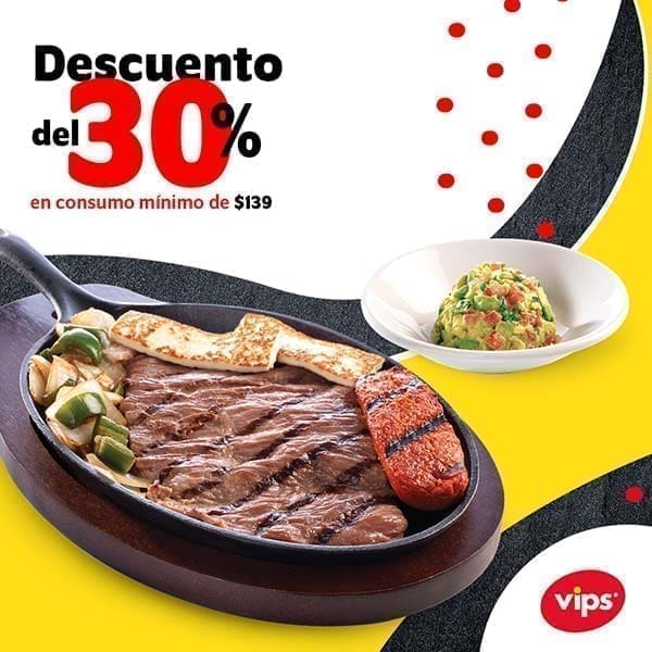 Vips te tiene para ti un cupón de 30% de descuento para un consumo mínimo de $139 pesos todos los días de la semana de 7:00 a 23:00 hrs.