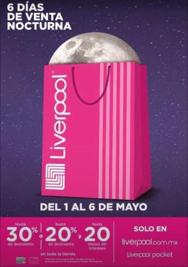 La próxima Venta Nocturna Liverpool será del 1 al 6 de mayo de 2020 para celebrar el Día de las Madres este 10 de mayo. La venta Nocturna será solo en compras por Internet a través de su tienda en línea y Aplicación de celular Liverpool Pocket.