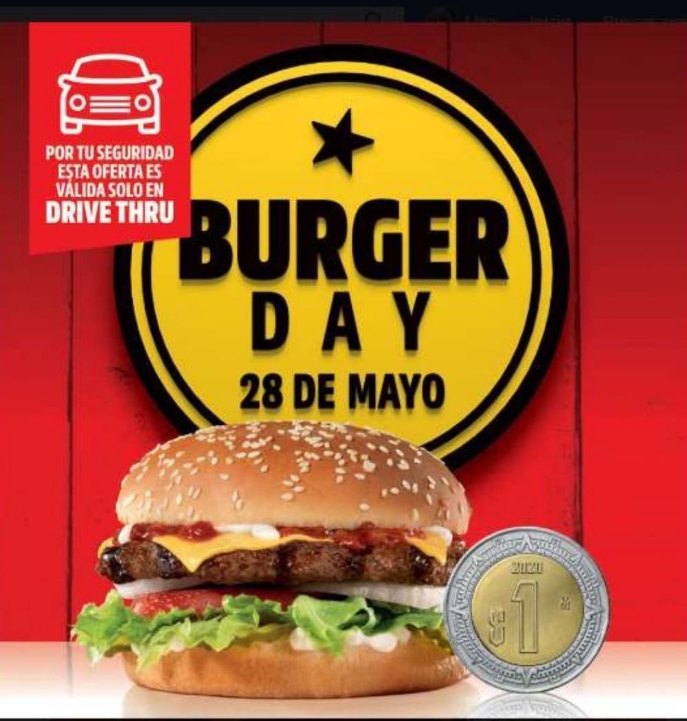 No te pierdas la gran promoción Burger Day  en Carl’s hoy jueves 28 de mayo del 2020 en la compra de un combo por Drive Thru, se llevan una hamburguesa Famous Star con queso a sólo $1 peso.