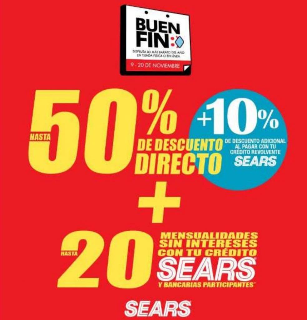 Tiendas Sears dan inicio al Buen Fin 2020 con grandes descuentos en ropa accesorios, telefonía compra todo lo que necesites a meses sin intereses y aprovecha la oferta estelar que tendrán durante el buen fin del 9 al 20 de noviembre: hasta un 50% más un 10% adicional pagando con crédito revólvente Sears y hasta 18 meses sin intereses con las tarjetas participantes.