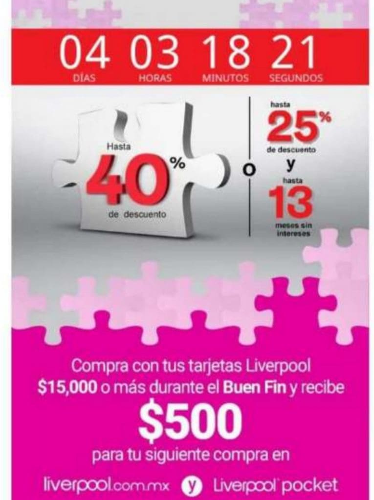 - Hasta 40% de descuento o hasta 25% de descuento y hasta 13 meses sin intereses y si compras con tus tarjetas Liverpool $15,000 o más durante el Buen Fin recibes $500 para tu siguiente compra en la tienda online Liverpool.com.mx y Liverpool Pocket.