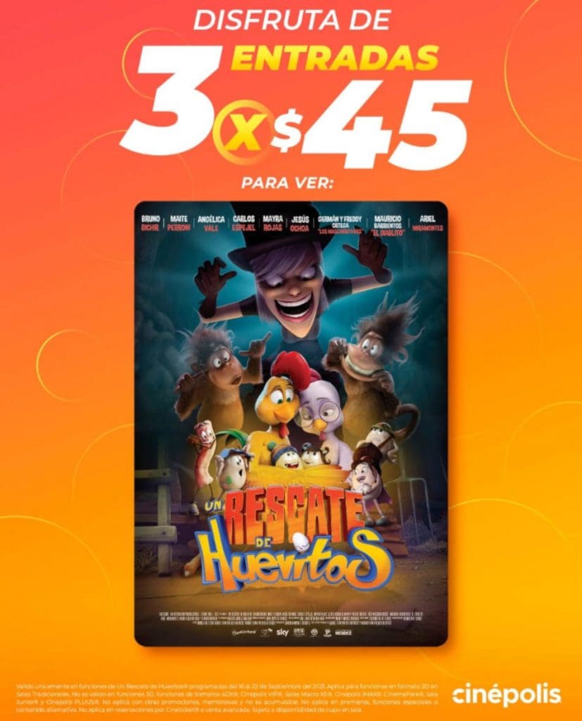 No te pierdas la película Un Rescate de Huevitos en Cinépolis con una gran promoción de 3 entradas por solo $45 y la promoción es valida para funciones programadas del 17 al 22 de septiembre del 2021 en los formatos 2D en salas tradicionales.