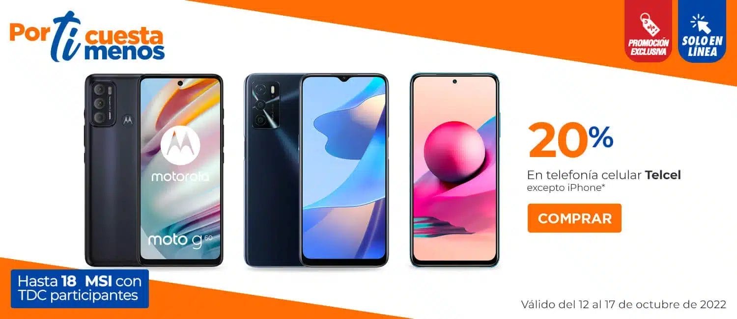 - 20% en telefonía celular Telcel excepto Iphone y hasta 18 meses sin intereses con tdc participantes.