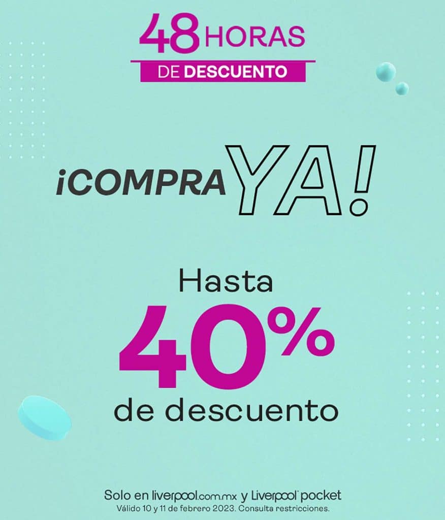 Les comparto la promoción de Liverpool 48 Horas de Descuentos para este 10 y 11 de febrero 2023 con hasta un 50% de descuento. Estas ofertas son validas en productos participantes que aplican sólo en su tienda en línea liverpool.com.mx y en su App Liverpool Pocket. Estos son algunos descuentos que puedes aprovechar: