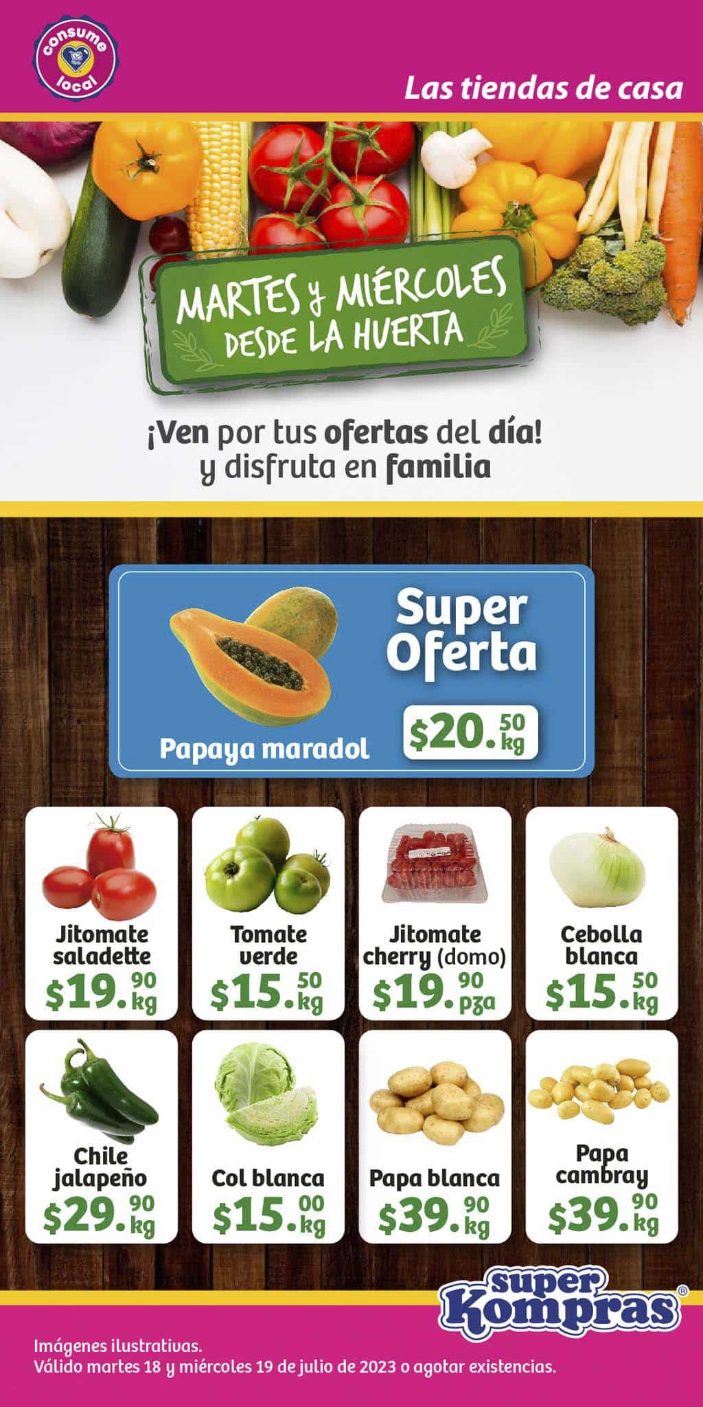 Las comparto el folleto de Super Kompras “Martes y Miércoles desde la Huerta” con las ofertas de Frutas y Verduras para este 18 y 19 de julio de 2023, donde encontraras descuentos y precios especiales: