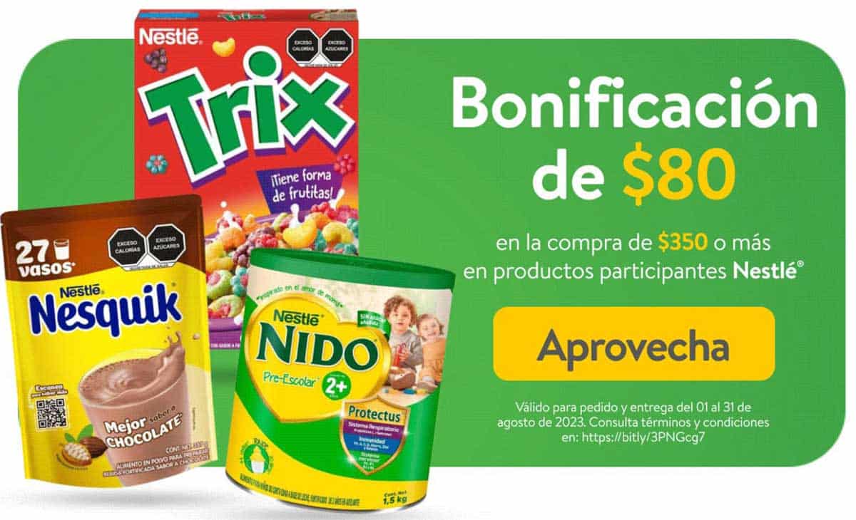 Walmart Super te ofrece la promoción de $80 pesos de Bonificación en la compra mínima de $350 en productos Nestlé participantes. Esta oferta aplica en pedidos realizados en su App sección “Entrega a partir de 60 min.” (Que puedes descargar en Google Play ó App Store) y en su tienda en línea super.walmart.com.mx.