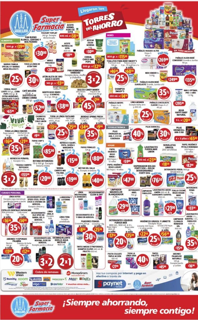 Ya salió el folleto de Farmacias Guadalajara Torres del Ahorro, que contiene las ofertas válidas para este fin de semana del 15 al 17 de septiembre de 2023, donde encontrarás promociones de 2×1, 3×2, Descuentos y Precios especiales en productos participantes en sus departamentos de Alimentos, Hogar, Fotoelectrónica, Bebés y Cuidado Personal.