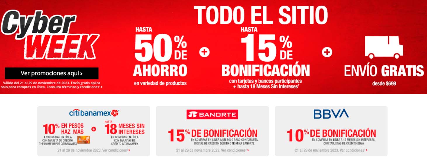 Ya termino el Buen Fin y ahora comenzó el Cyber Week en tiendas Home Depot en el que ofrecen 15% de bonificación con Banorte y 10% de bonificación con BBVA.