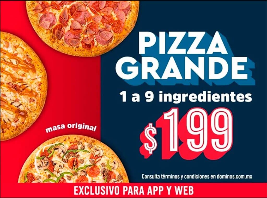 Aprovecha la promoción que Dominos Pizza tiene para ti en esta Navidad, en la que te puedes llevar una Pizza masa original de hasta 9 Ingredientes a precio especial de sólo $199 pesos. Pide una Pizza Grande como te gusta y disfruta con tus amigo o familiares.