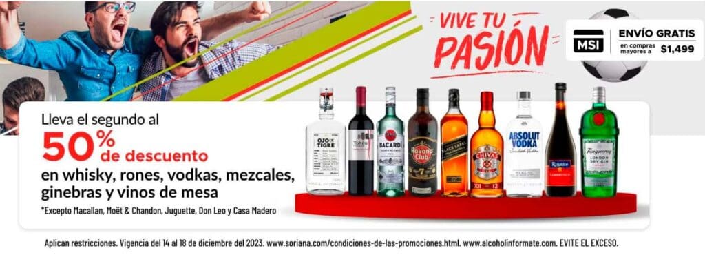 La tienda en línea de Soriana tiene disponible la promoción Vive tu Pasión en la que si compras uno te llevas el segundo al 50% de descuento en whisky, rones, vodkas, mezcales, ginebras y vinos de mesa. Excepto Macallan, Moët & Chandon, Juguette, Don Leo y Casa Madero. Además obtén meses sin intereses pagando con tarjetas bancarias participantes y Envió Gratis haciendo una compra mínima de $1,499. Cabe mencionar que La Comer tiene una oferta similar, hay le dejo el enlace por si les interesa.