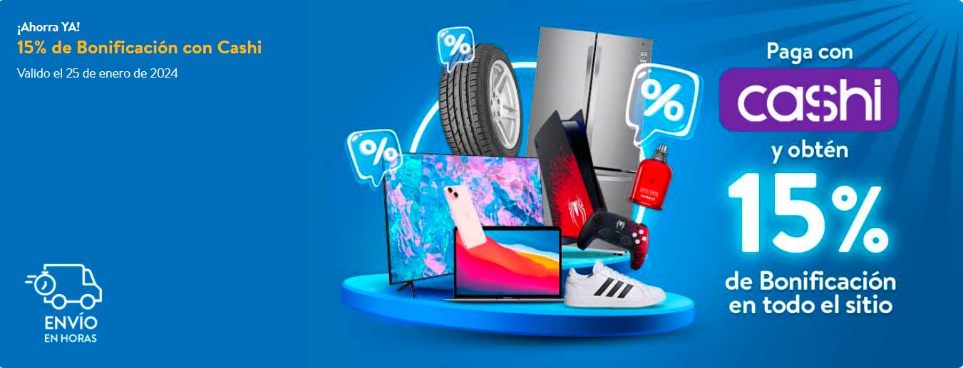 Las tiendas Walmart tienen la promoción de 15% de bonificación en todo el sitio al pagar con Cashi haciendo una compra mínima de $1,999. Bonificación topada a $1,500. Limitado a 1 promoción por cuenta.