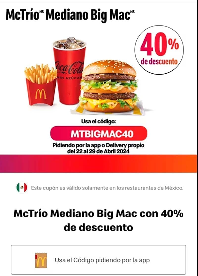 Los restaurantes de comida rápida McDonald’s tienen en promoción su McTrío Mediano Big Mac con 40% de descuento en horario de comida. Aplica pidiendo por la app a través de la funcionalidad de PickUp o Delivery Propio e ingresando el cupón con código MTBIGMAC40. No acumulable con otras promociones.