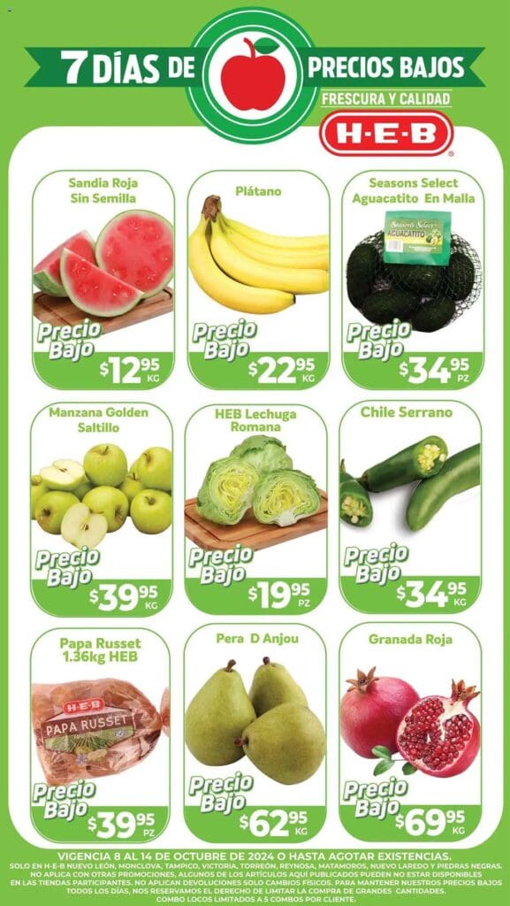 Las tiendas HEB dieron a conocer su folleto “7 Días de Precios Bajos” con las ofertas en frutas y verduras válidas del 8 al 14 de octubre de 2024, donde encontrarás precios especiales en sucursales participantes cada semana.