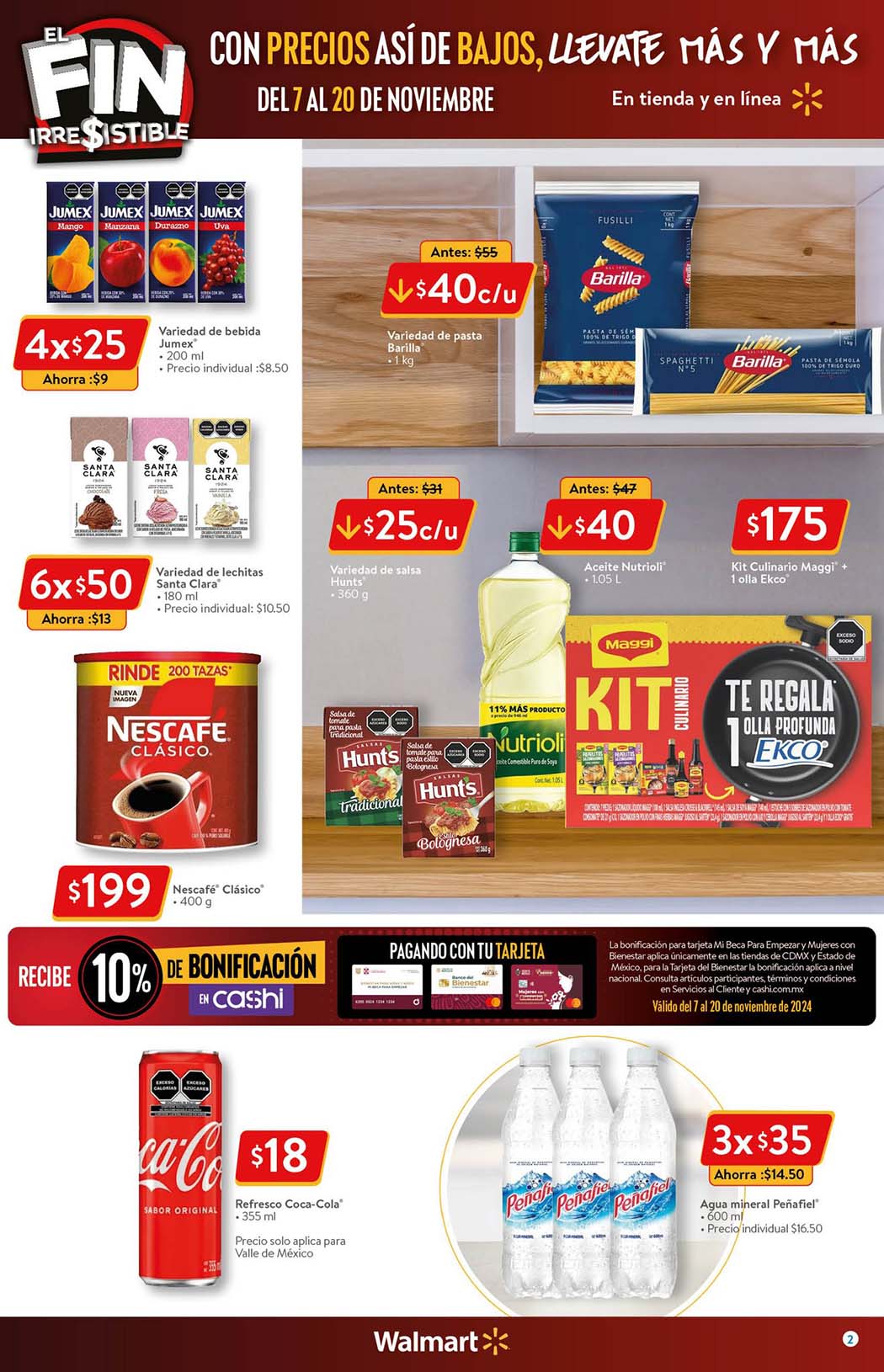 Les comparto el folleto El Fin Irresistible Walmart Con Precios así de Bajos, Llévate Más y Más, que contiene ofertas válidas del 07 al 20 de noviembre de 2024, donde encontrarás Promociones, Bonificación en Cashi si pagas con tus Tarjetas del Gobierno, Meses sin intereses, Descuentos y Precios especiales que aplican en productos seleccionados de Abarrotes, Despensa, Hogar, Lácteos, Embutidos, Bebés y productos para el cuidado personal.