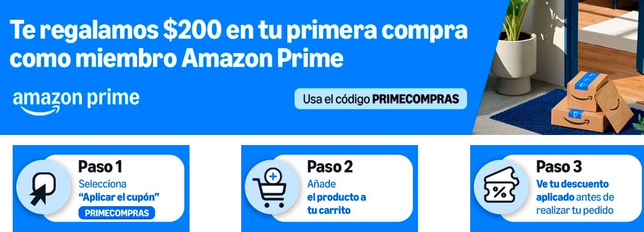 Amazon México tiene un cupón con el que obtendrás $200 pesos de descuento en en tu primera compra como miembro Prime. Aplica para compras mínimas de $400 pesos en productos vendidos y enviados por amazon.com.mx. El código aplica únicamente una vez por cliente. En la página siguiente con título “Revisar tu pedido – Confirmación” deberás ingresar el cupón PRIMECOMPRAS para obtener el beneficio.