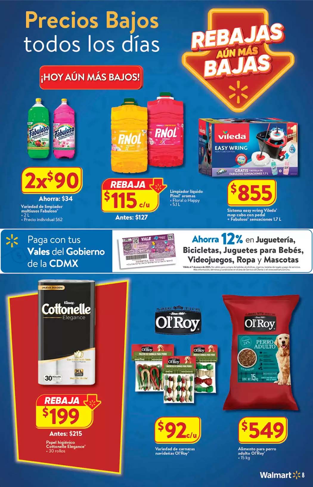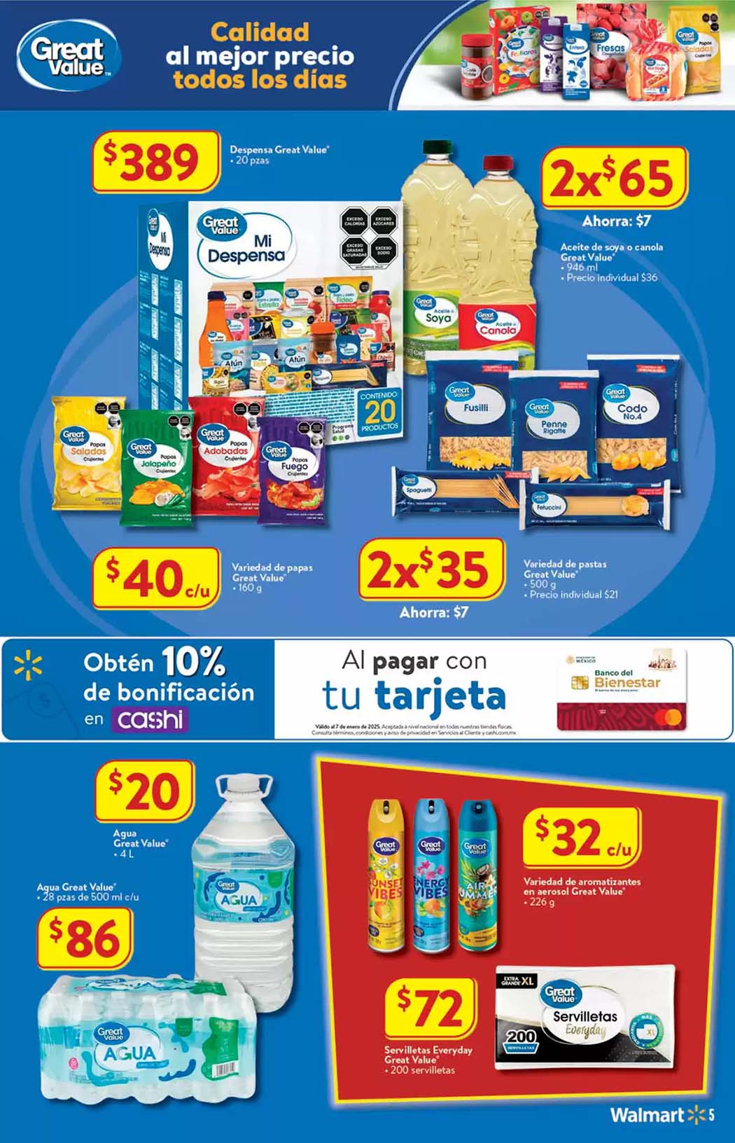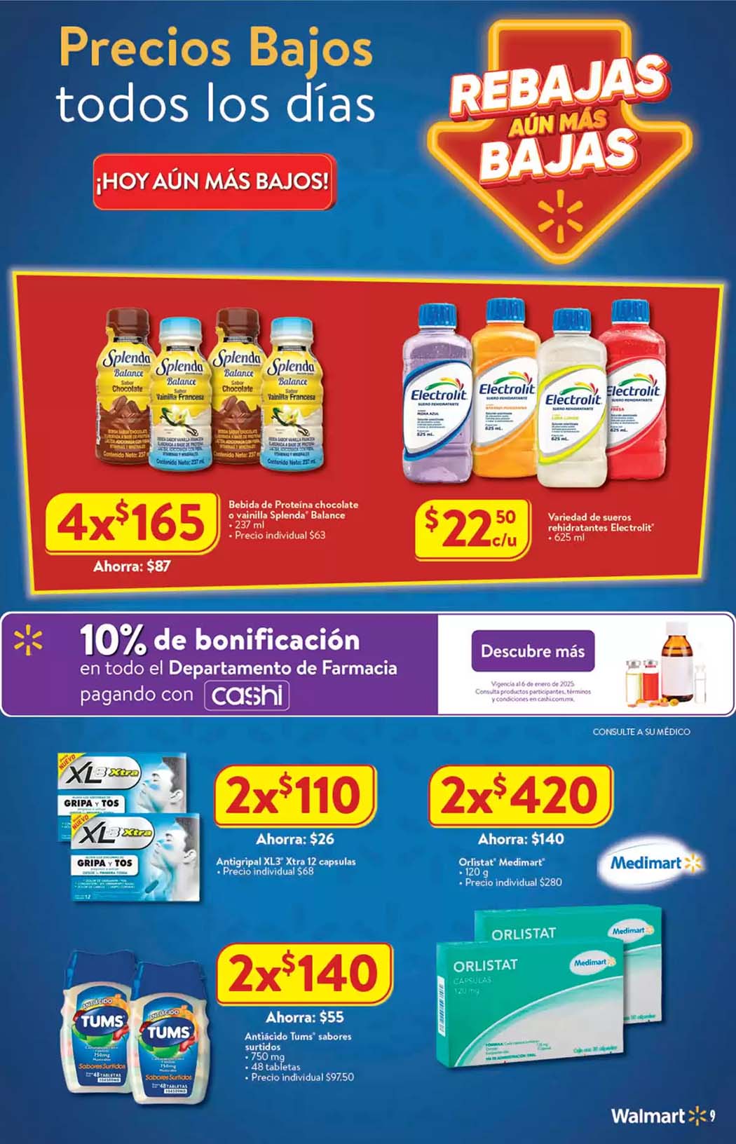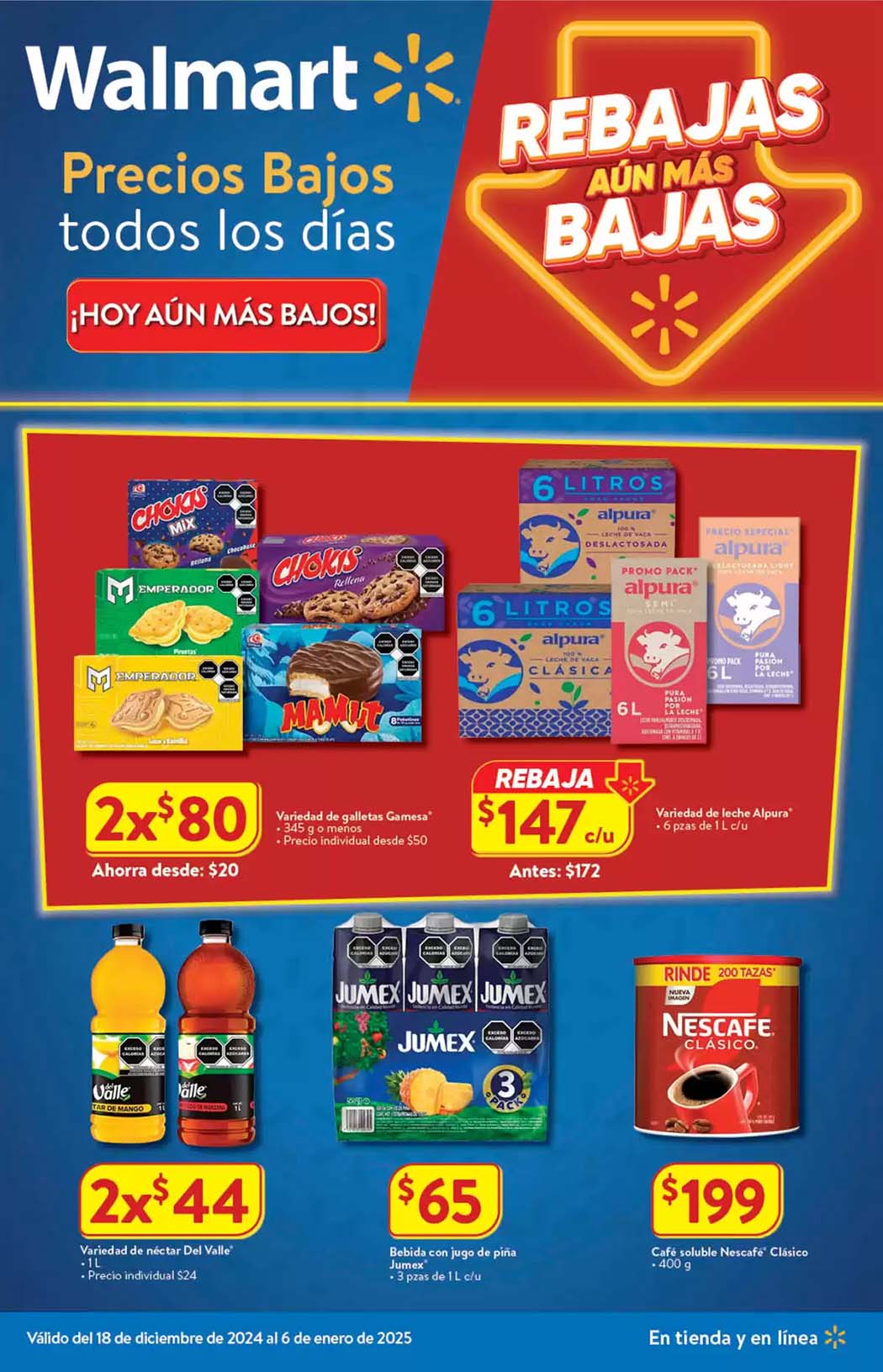 Les comparto el folleto de Walmart Rebajas Aún más Bajas, Precios Bajos todos los Días válido del 18 de diciembre 2024 al 6 de enero 2025, donde encontrarás Ofertas, Bonificación en Cashi si pagas con tu Tarjeta del Bienestar, Meses sin intereses con tarjetas participantes, Descuentos y Precios especiales válidos en productos seleccionados de abarrotes, alimentos, bebidas, hogar, limpieza, cuidado personal, farmacia, bebes, mascotas y mucho más que aplican en sus sucursales físicas y en su tienda en línea walmart.com.mx.