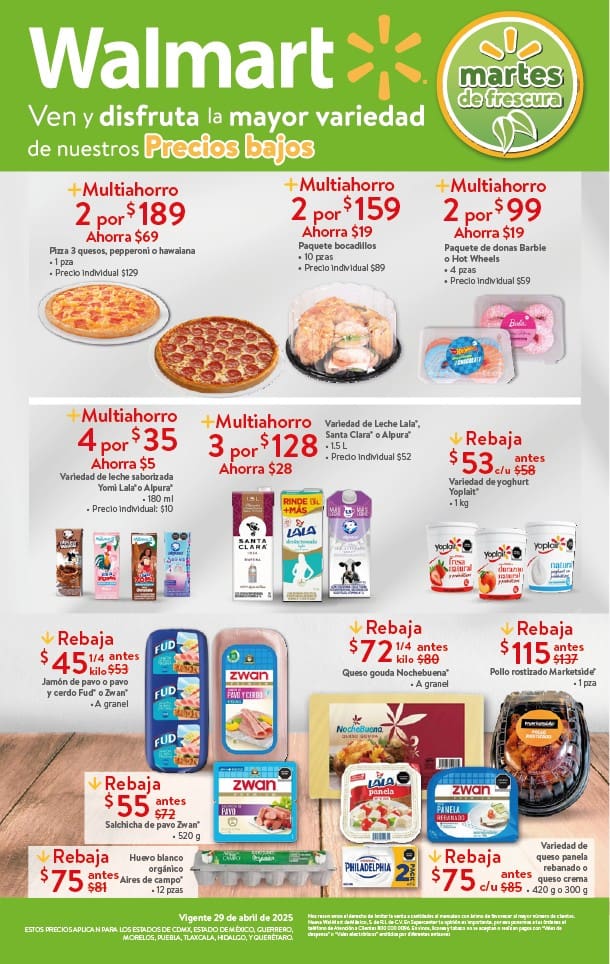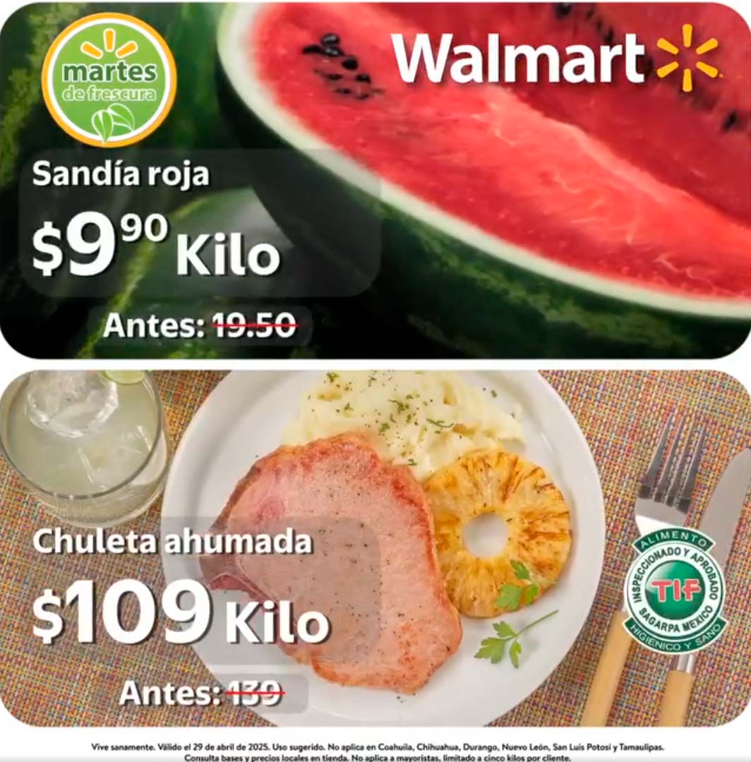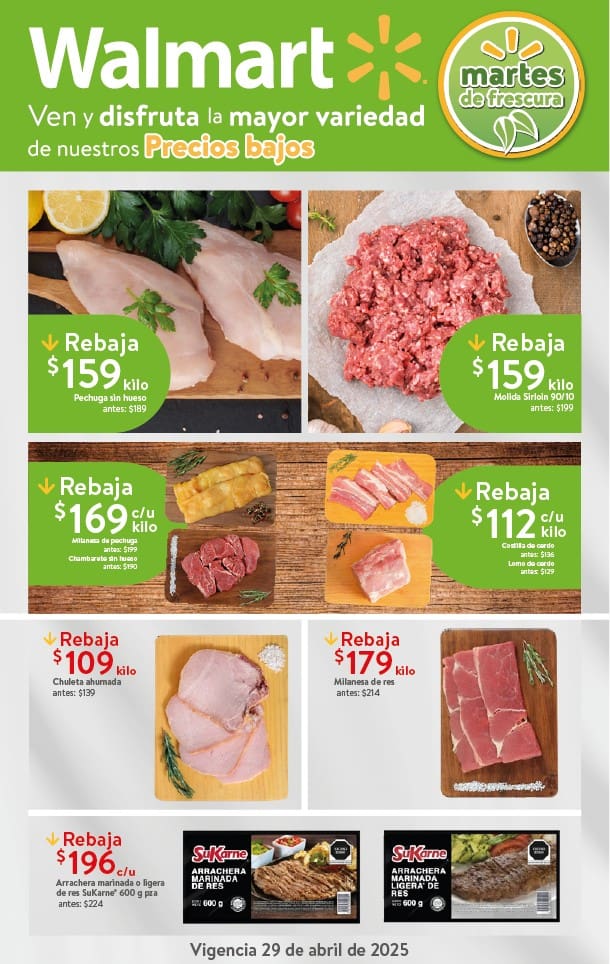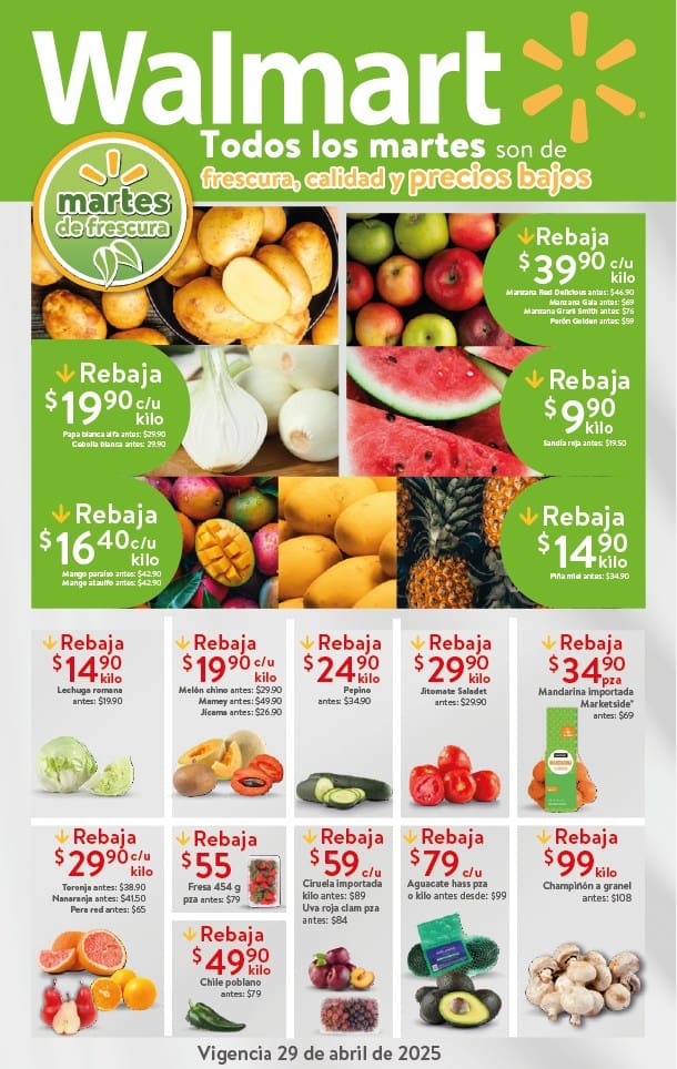El Martes de Frescura Walmart 29 de abril de 2025 tendrá las siguientes ofertas en carnes, frutas y verduras válidas en tiendas Walmart y Walmart Express de la República Mexicana. Te comparto la lista completa de precios que puedes aprovechar esta semana.