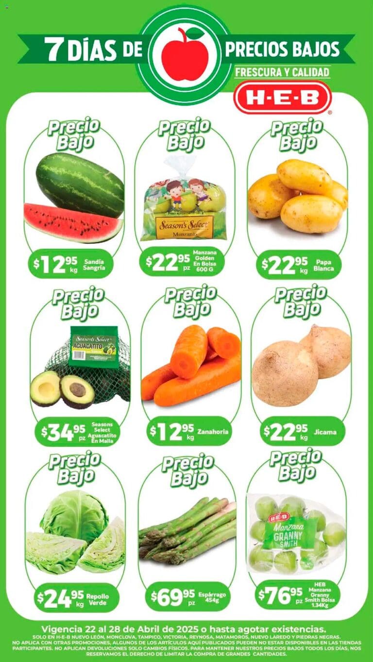 Estoy viendo el folleto de HEB “7 Días de Precios Bajos” con las ofertas de frutas y verduras válidas del 22 al 28 de abril 2025, en el que encontrarás promociones especiales en sucursales participantes de la República Mexicana.