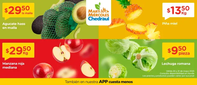 Aprovecha las ofertas de frutas y verduras que encontrarás en el Martimiércoles de Chedraui los días martes 20 y miércoles 21 de mayo de 2025 que aplican en tiendas Chedraui participantes de la república Mexicana. Les comparto la lista completa de precios para que ahorres varios pesos por tus compras.