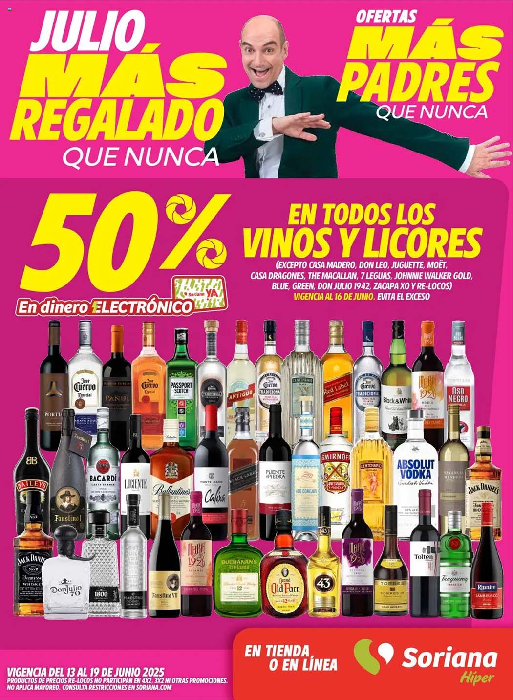 - 50% en Dinero Electrónico Soriana Ya en Todos los Vinos y Licores (excepto Casa Madero, Don Leo, Juguette, Moet, Casa Dragones, The Macallan, 7 Leguas, Johnnie Walker Gold, Blue, Green, Don Julio 1942, Zacapa Xo y Re-Locos)