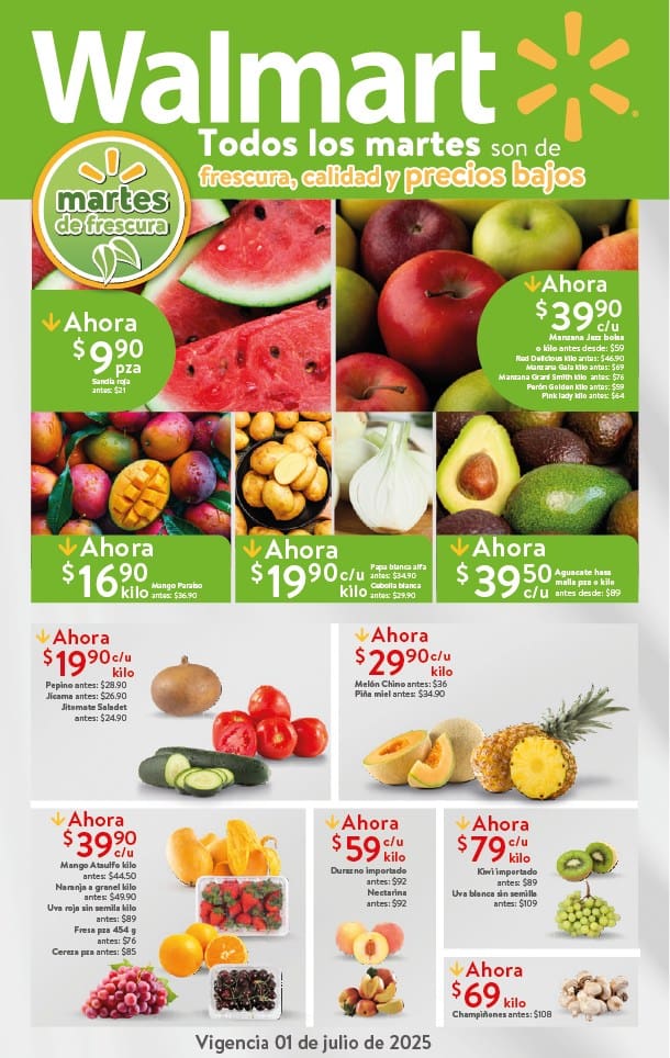 El Martes de Frescura Walmart de esta semana presenta las siguientes ofertas de frutas y verduras válidas el 1 de julio de 2025 que aplican en tiendas Walmart y Walmart Express de la República Mexicana. Te comparto la lista completa de precios que puedes aprovechar esta semana.