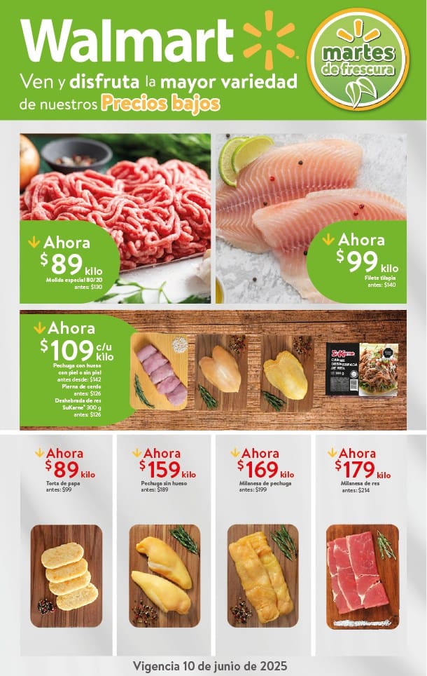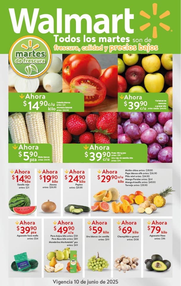 El Martes de Frescura Walmart del 10 de junio de 2025, presenta las siguientes ofertas en carnes, frutas y verduras que aplican en tiendas Walmart y Walmart Express de la República Mexicana. Te comparto la lista completa de precios que puedes aprovechar esta semana.