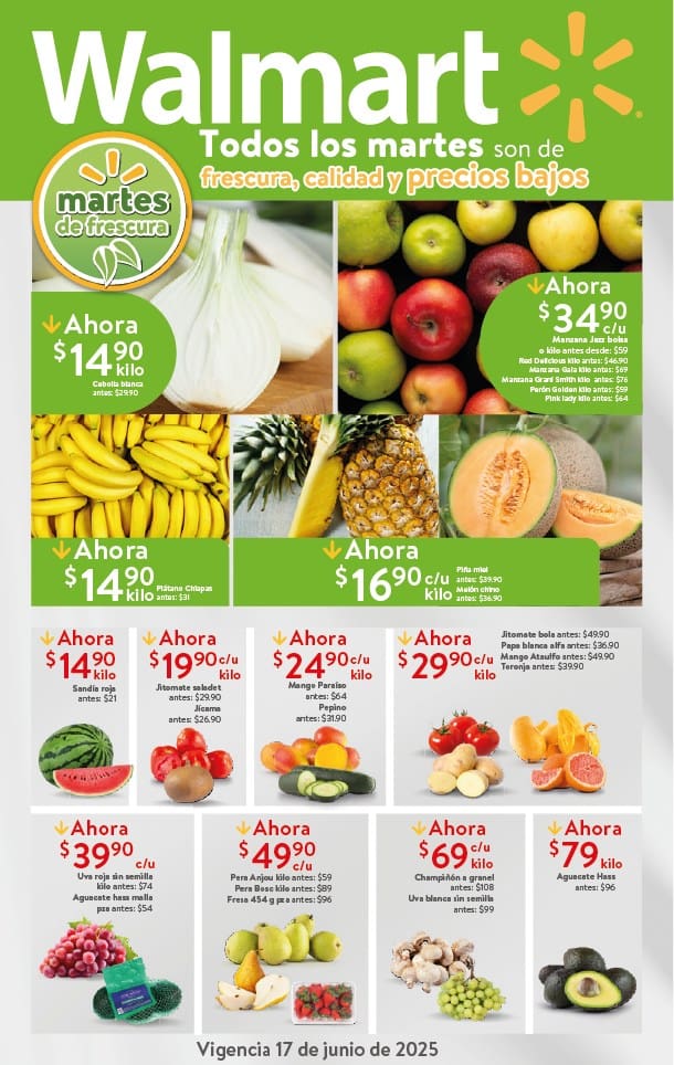 El Martes de Frescura Walmart de esta semana tiene preparadas las siguientes ofertas de frutas y verduras válidas el 17 de junio de 2025 que aplican en tiendas Walmart y Walmart Express de la República Mexicana. Te comparto la lista completa de precios que puedes aprovechar esta semana.